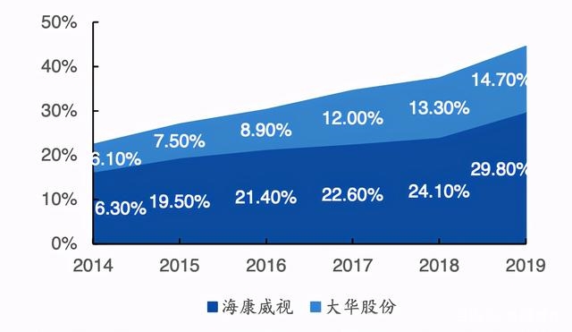 根据A&S公布的《2020安防50强》,按照2019年的营业收入排名,海康威视与大华股份份额占比分别为29.80%和14.70%,CR2达到44.50%,马太效应非常明显,强者恒强。