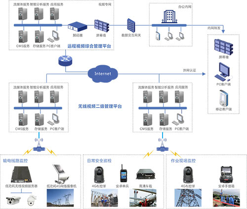 输电线路智能监测视频综合系统监控现场分为2类组网方式:
